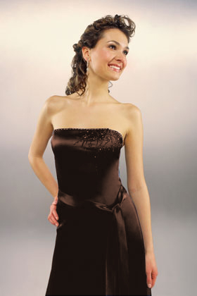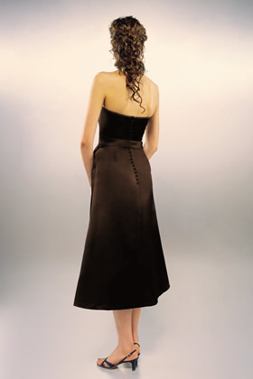 Below knee bridesmaid dress in chocolate brown matte satin. Beautiful embroidery in stain stitch and beading. Relaxed tie belt which can be fastened front or back or removed altogether. Fastens with a zip which is edged with covered buttons. Boned bodice and fully lined. Optional shoestring straps.
