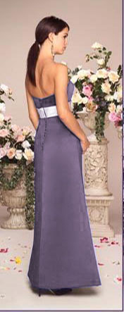 Simple strapless bridesmaid dress in a lilac/lavender colour. Main dress is a matte satin and the bow is in ivory taffeta. A gentle A-line shape with no back slit. Fastens with a zip and has covered buttons to trim. Fully lined with a boned bodice. Comes with optional shoestring straps.