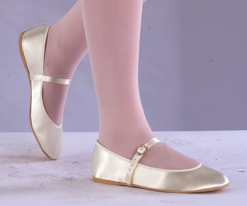Flat matte satin bridesmaid shoe in ivory with bar/buckle fastening. Resin sole.
