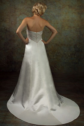 Ivory matte satin A-line wedding dress with chapel train. Looks like separates but is a one piece dress. Optional shoestring straps and a wrap come with the dress. Boned bodice and netted underskirts. Fastens with a zip. Delicate beaded embroidery which includes some maroon coloured beads.