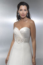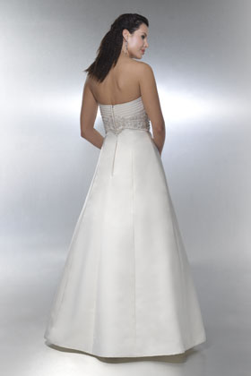 A princess line dress in ivory imperial satin. Sweetheart neckline and cross-over pleated bodice. Delicate beaded embroidery - tiny seed pearls and antique silver beads.