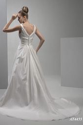 Silky taffeta wedding dress with deep plunge neckline and train.Lots of pleating in the skirt which falls beautifully.