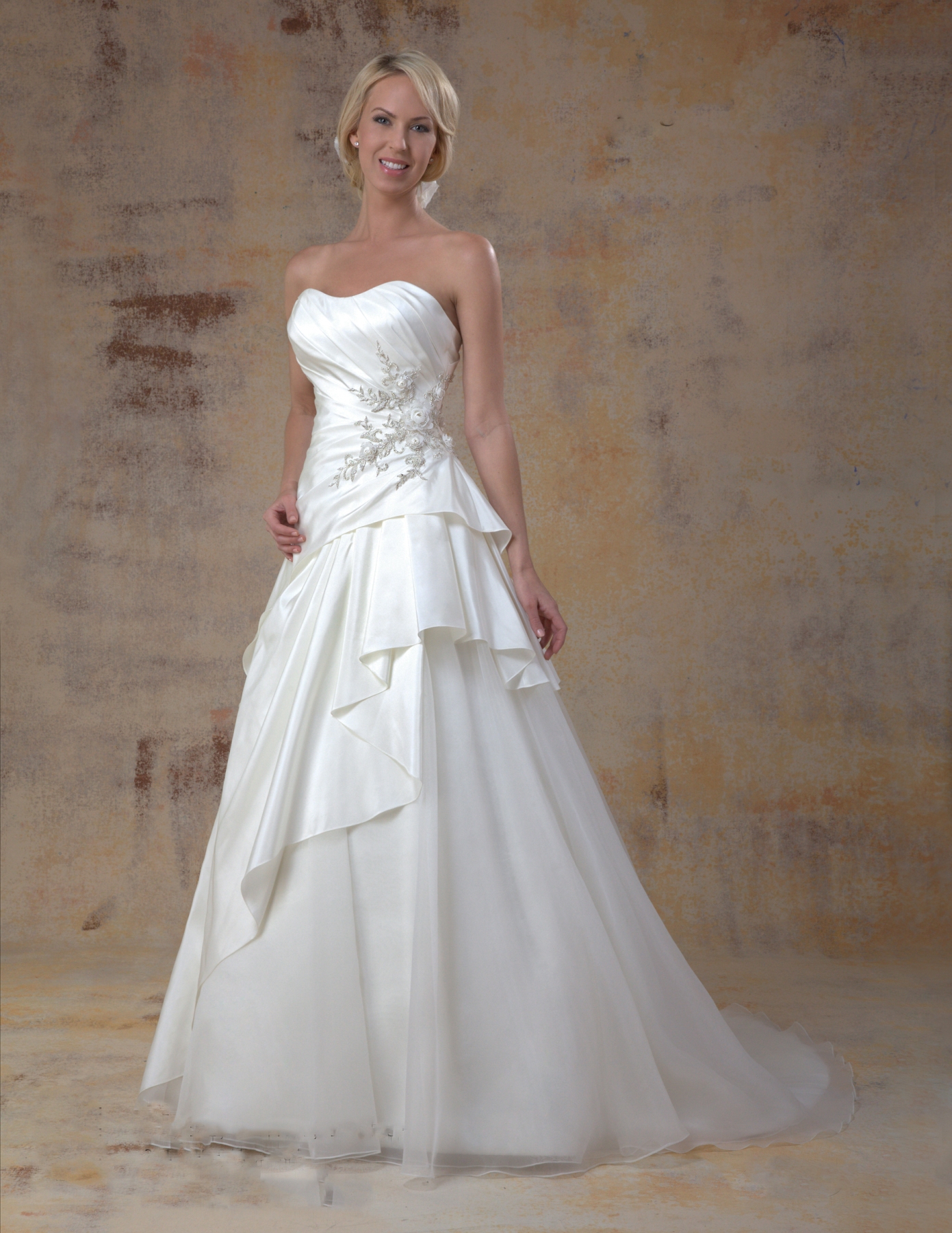 Strapless taffeta gown overlaid on organza skirt with dip neckline and chapel train. Ruched bodice with applique, decorated with silver beads and ivory flowers. Two tier side drape. Zipped back with covered buttons to trim. Optional shoestring straps.